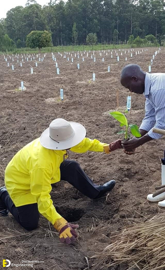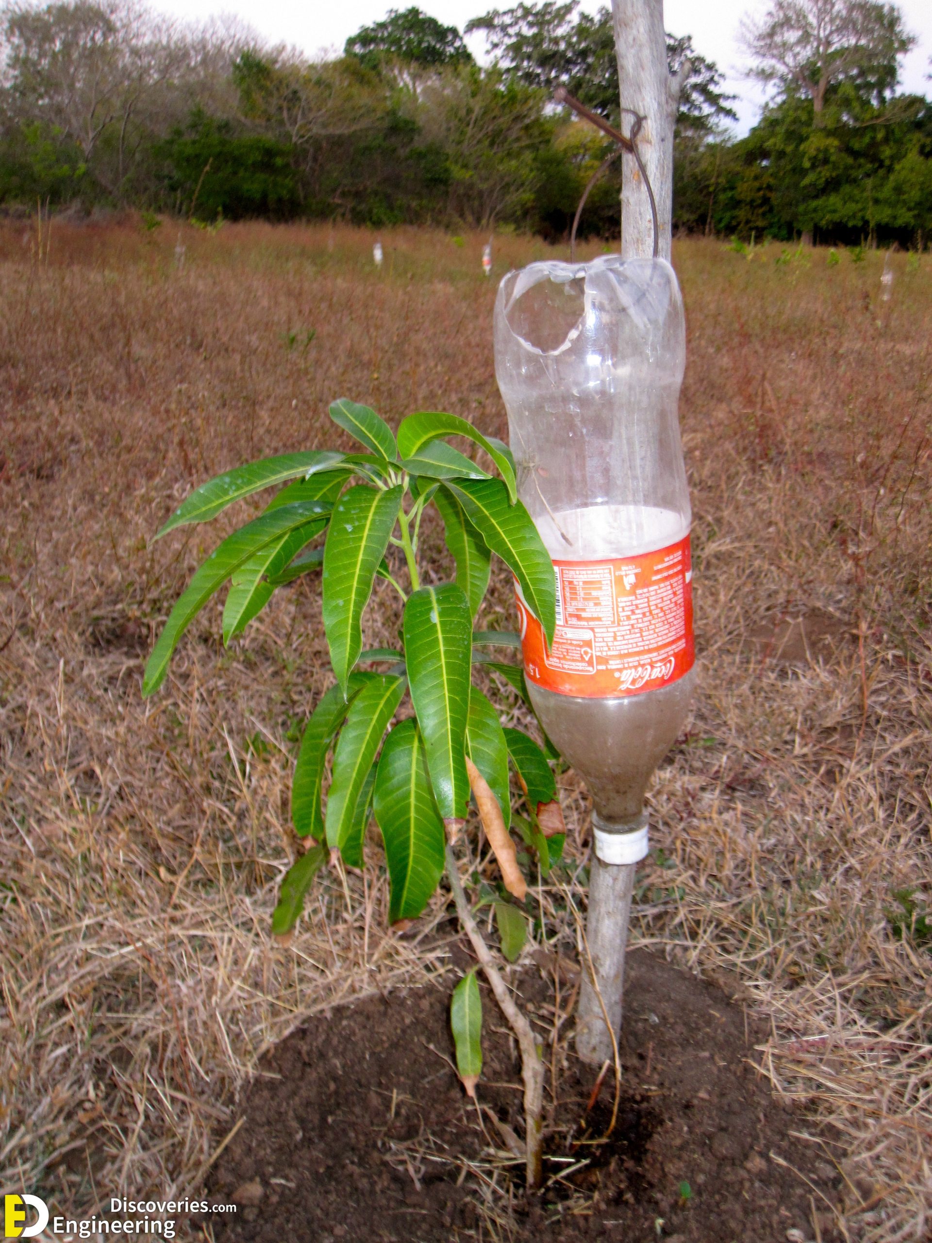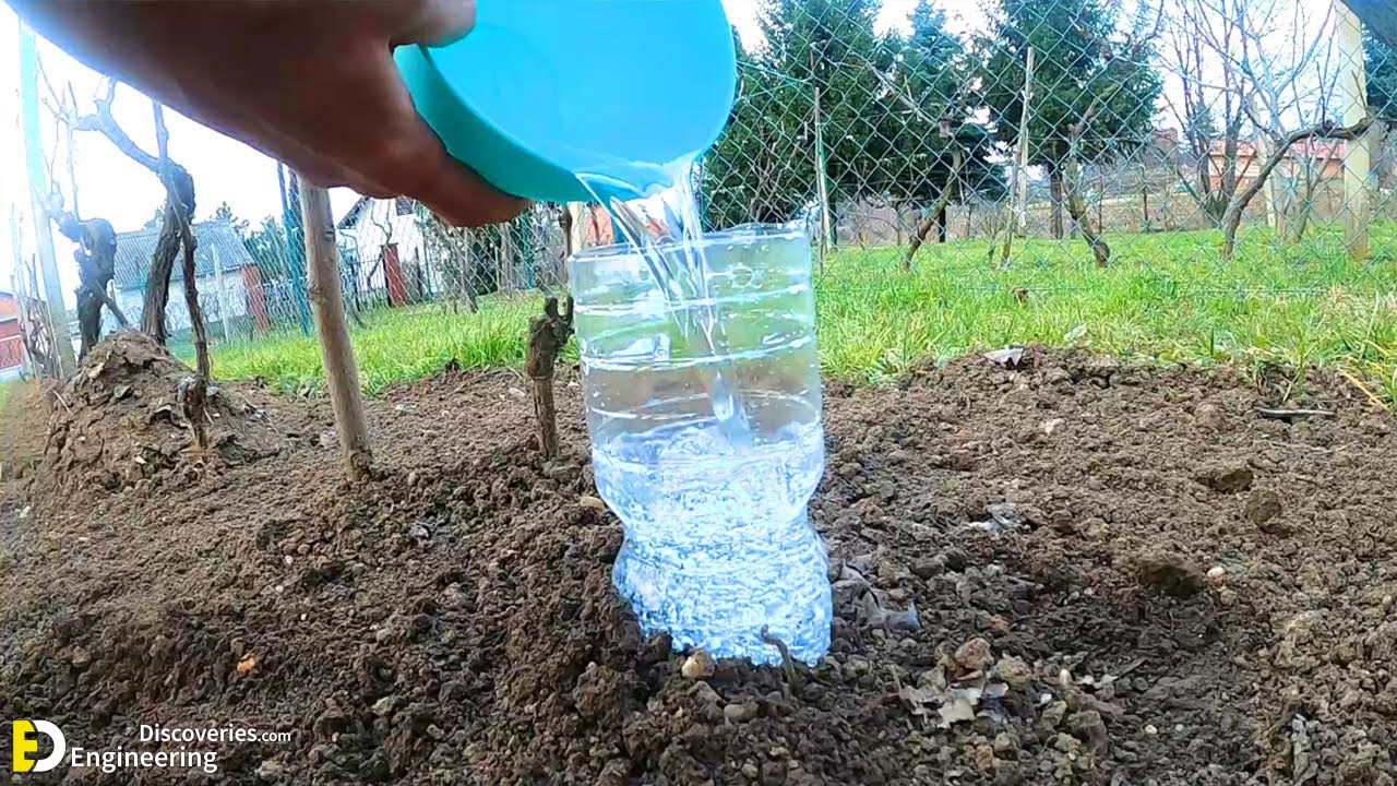 Fill the jug with water and cap it tightly. Poke one or two small holes in the bottom of the jug, and nestle it down in the dirt. Place the jug close to the base of the plant and in direct contact with the dirt. You may need to move away some of the mulch. The water will slowly seep into the soil.